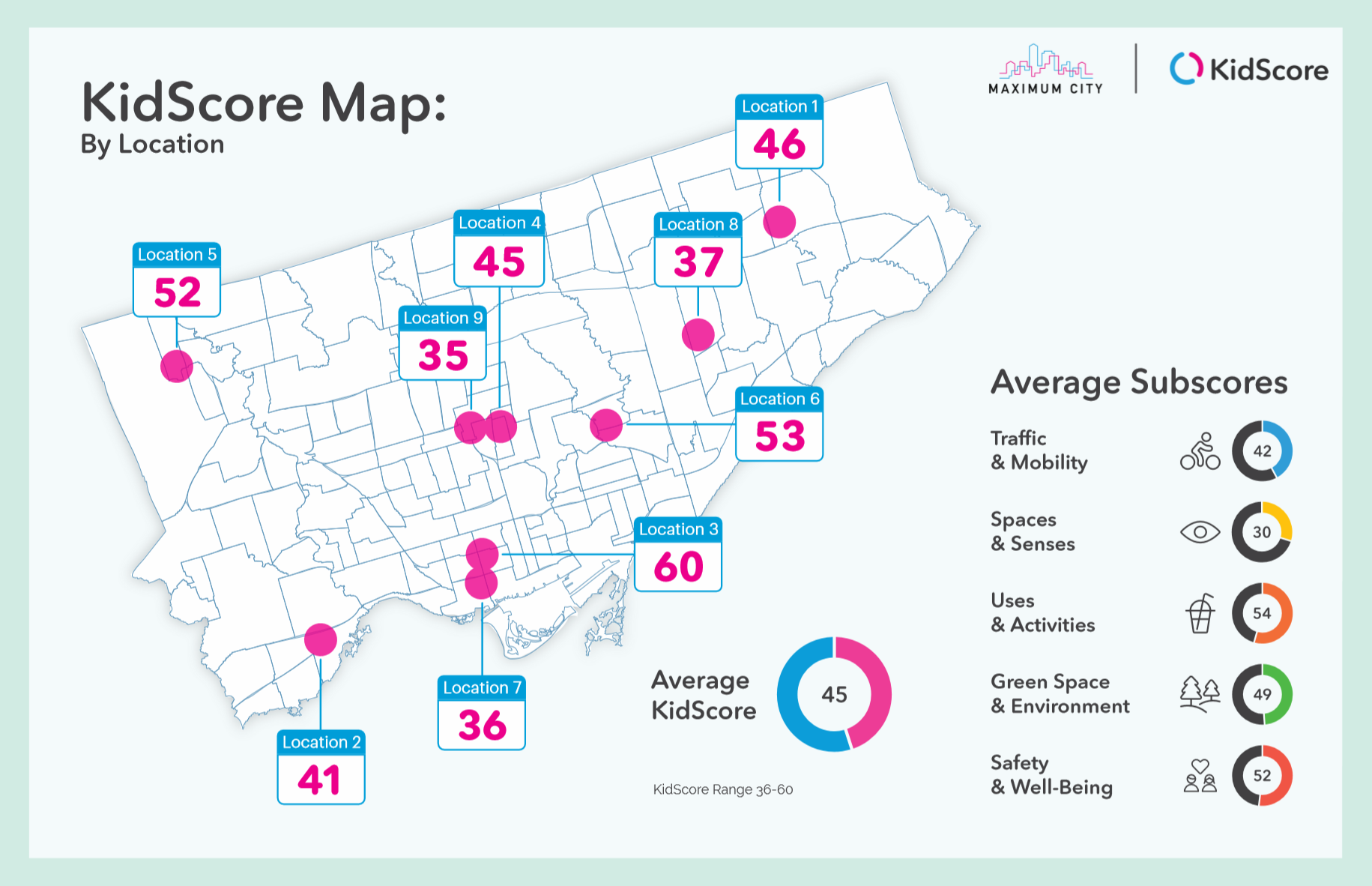 The KidScore is both an engagement tool and a metric for evaluating the child-friendliness of urban places. It was made by kids and experts to help create happier and healthier urban places for kids. In 2019, Maximum City conducted a pilot of the KidScore in nine communities for the City of Toronto’s Children’s Services. The goal was to engage kids in assessing the child-friendliness of nine diverse locations using the KidScore, and produce actionable data for improving child-friendliness at the neighbourhood and city-wide level. In total, 248 kids ages 5-13, their teachers, program staff, parents, City staff and a variety of researchers and experts all contributed to the 2019 KidScore Pilot Program. The project was recognized by IAP2’s Core Value Award for Diversity and Inclusion.